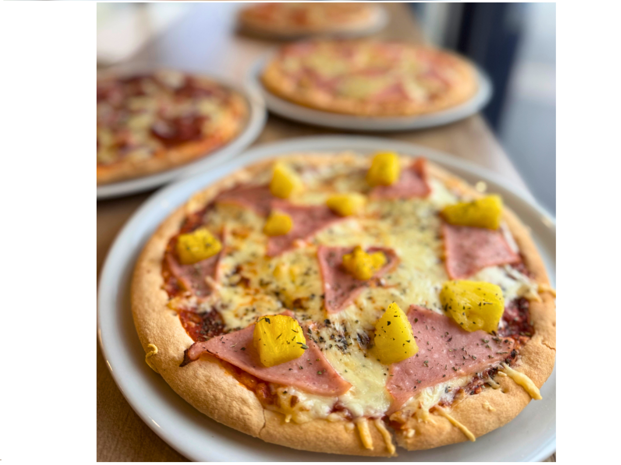 Gluténmentes saját készítésű pizzatészta, sonka, ananász, laktózmentes trappista sajt, pizzaszósz