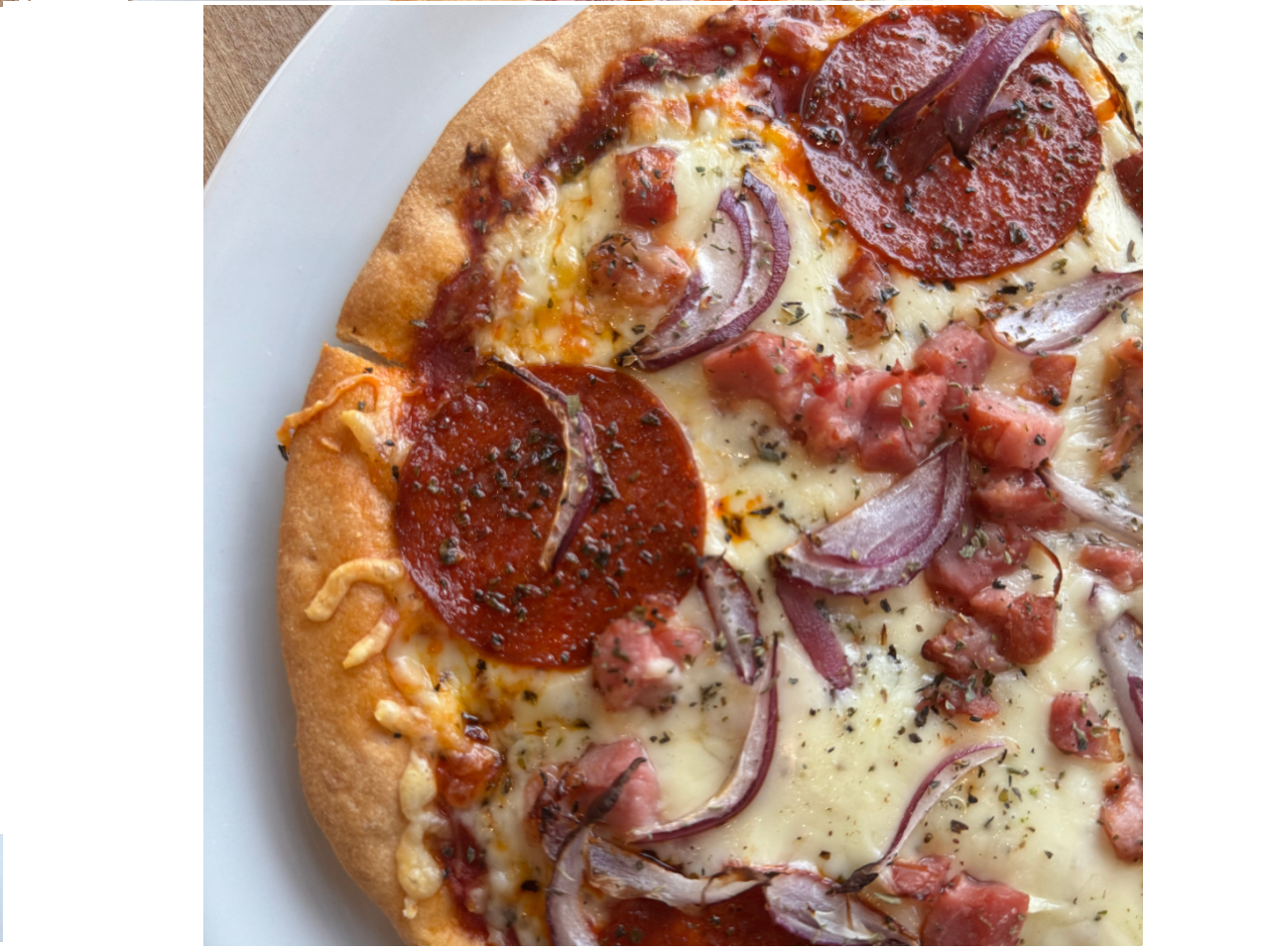 Gluténmentes saját készítésű pizzatészta, szalámi, bacon, lilahagyma, laktózmentes trappista sajt, pizzaszósz